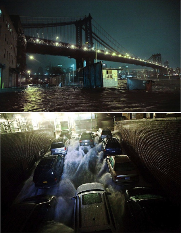 Je ne suis pas sûr qu’il rimerait à quelque chose de faire des statistiques pour le vérifier, mais il semble que la très grande majorité des images que nous recevions de l’ouragan Sandy et de ses effets sur la côte Est des États-Unis, une histoire “vraie”, soient des images “fausses”, c’est-à-dire qui s’écartent sciemment de l’illusion du témoignage objectif : montages, retouches, images d’archives, images d’actualité ayant l’apparence de photos d’archives, pastiches, images extraites de films. Et il n’est pas forcément question de tromperie, puisque c’est le public, par les réseaux sociaux, qui sélectionne les images qui circulent, qui les diffuse et, parfois, qui les crée.